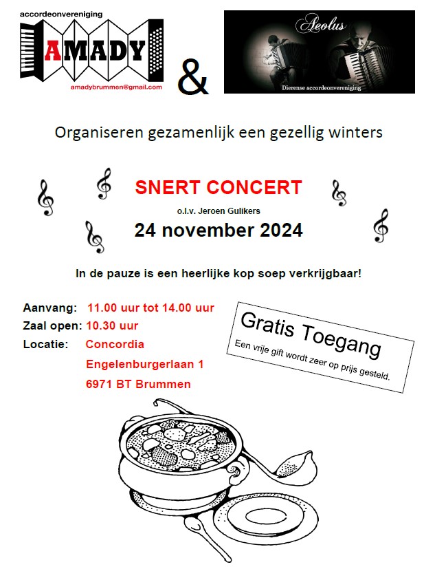 Op zondag 24 november 2024 houden Accordeonverenigingen Aeolus Dieren en Amady Brummen gezamenlijk een gezellig winters snert concert o.l.v. Jeroen Gulikers. In de pauze is er een lekkere kop snert verkrijgbaar!